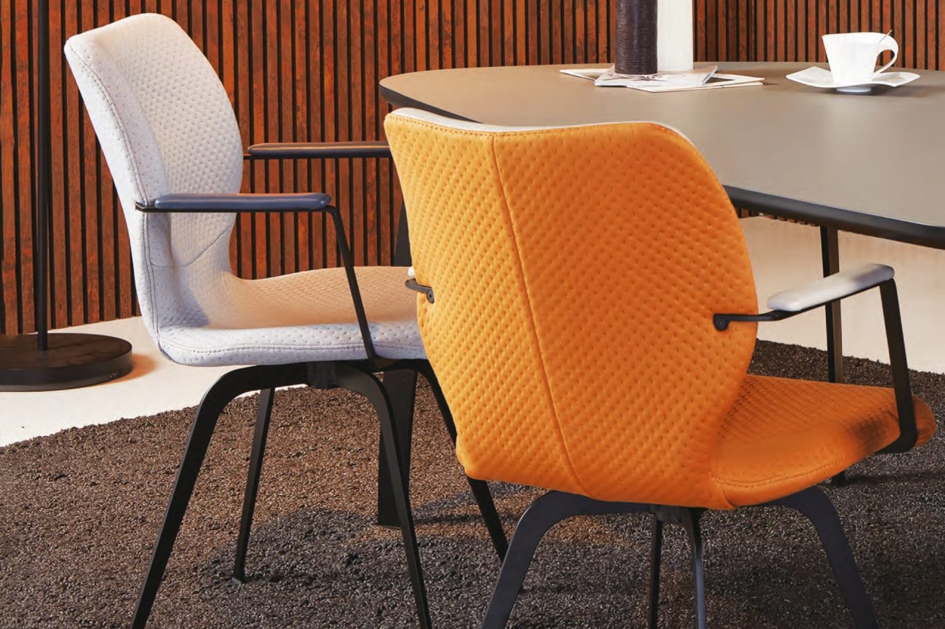 Modern, comfortabel en perfect om urenlang te tafelen. Ergonomische zithoogte, met vloerglijders of optioneel wieltjes.